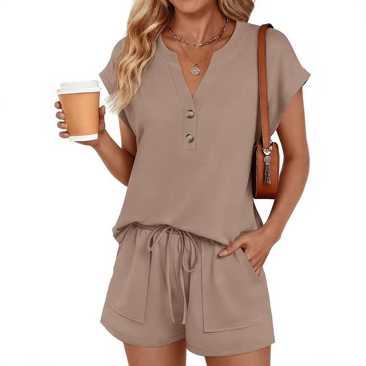 Solid-color V-neck Button-front Short-sleeve Shorts Set